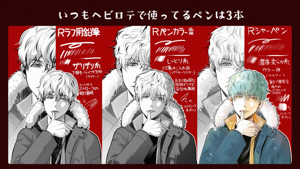 【線画に使ってるペンのご紹介】 落書きでは他の人のを使ったりもしますが、メインはこの3本でカラーもモノクロも仕事では真ん中のやつのみです(FANBOXの原稿も全部このペン) twitter.com/rabimaru_t/sta…