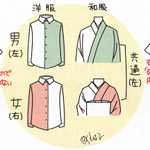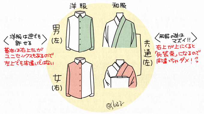 因みに洋服は右利き使用人が婦人に着せやすかったので左上になったとか 着物は洋服とは違い「右前」と言っても右が上という意味ではなく「右先に」という意味なので実際見た目は左が上 洋服の「前」とは意味が違うということだ 基本女性は洋服と和服では逆になる 男性は洋服和服共に左上 twitter.com/miduki_85/stat…