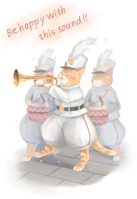 マーチングバンド猫です。 『Be happy with this sound!!(この音で幸せになろう!!)』 ※楽器、マーチングバンドに詳しくない為細かい部分については優しく見てください。 #オリジナルイラスト #動物 #猫 #絵描きさんとつながりたい