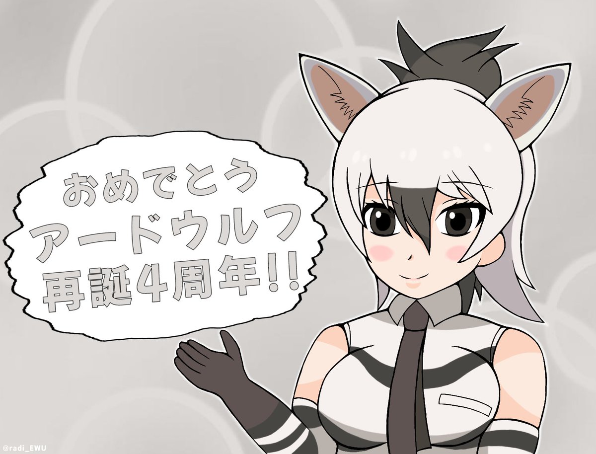 アードウルフちゃん、再誕4周年おめでとう!! アードウルフちゃんと、アードウルフちゃんファンの皆さんのために、周年記念イラストを描きました! アードウルフちゃん、これからも見逃せません…! #アードウルフ再誕4周年 #けものフレンズ pixiv.net/artworks/10510…