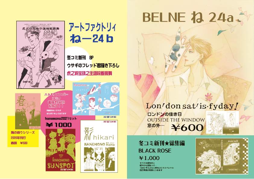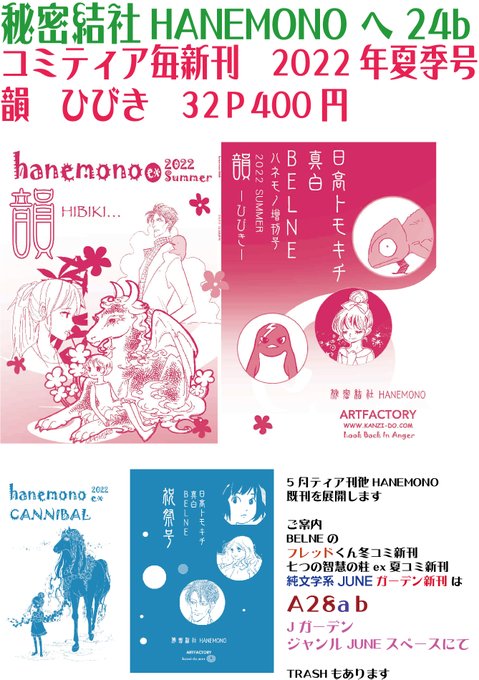 まずは秘密結社ハネモノの新刊のお知らせ。 #コミティア141 #COMITIA141 #秘密結社ハネモノ 日高トモキチ・真白が直接参加しております。 へ24b 秘密結社hanemono+アートファクトリィ 新刊 韻 HIBIKI~ひびき~ 真白 MUSIC 日高 おはようmimic belne みそらの夢 総32頁真白カラー口絵付きです。