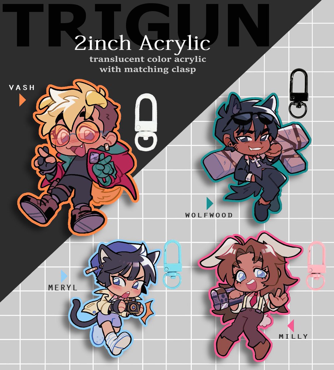 [PREORDER OPEN UNTIL 03/25] up for grabs now! get the members of team love & peace, vash, wolfwood, meryl and milly each in their own different flavor! details below: #TRIGUN #TRIGUNSTAMPEDE