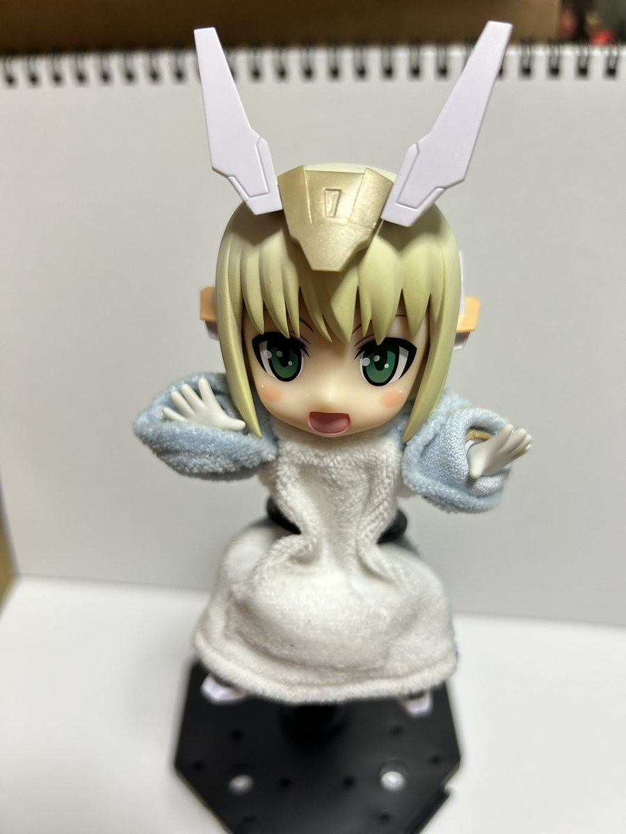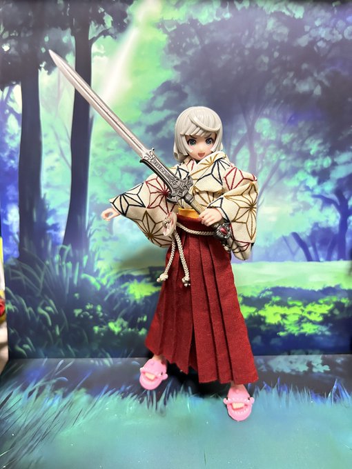 2 2 先日購入した月面散歩(@dounasi )さんの着物を着させて見たよ! 中々に可愛く出来た😍 布服沼に一直線😚 足のスリッパは(@pb_factory )さんのサメスリッパSサイズ🦈 武器は天然居士(@tennenkoji )さん所の古代王の剣です🗡️ 今気が付いたけど刃が曲がってるw #メガミデバイス #おいでよ布沼 23/05/22 22:38