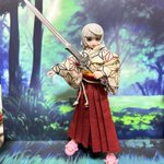 先日購入した月面散歩(@dounasi )さんの着物を着させて見たよ! 中々に可愛く出来た😍 布服沼に一直線😚 足のスリッパは(@pb_factory )さんのサメスリッパSサイズ🦈 武器は天然居士(@tennenkoji )さん所の古代王の剣です🗡️ 今気が付いたけど刃が曲がってるw #メガミデバイス #おいでよ布沼