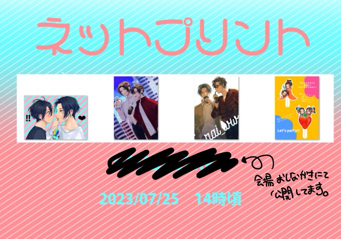 1 6 現代AU忘羨オンリー、スペース頂いてしかもイラストまで使用して頂いているのに貢献できずすいません…!!枯れ木も山の賑わいよね!とせめてネットプリントを用意しました。過去絵も特になくひどい感じですが、良ければ会場にてご確認いただけたらと思います。 23/06/25 15:09