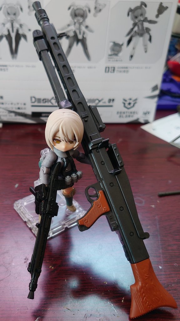300円で1/6のMG42かMk46出るって聞いて、1/100クラスのロボプラモに合うかなと思って買ってみたんですよ。…甘かった。 これはデカすぎる…あ、未明ちゃん使ってるのは単にMG繋がりです #デスクトップアーミー