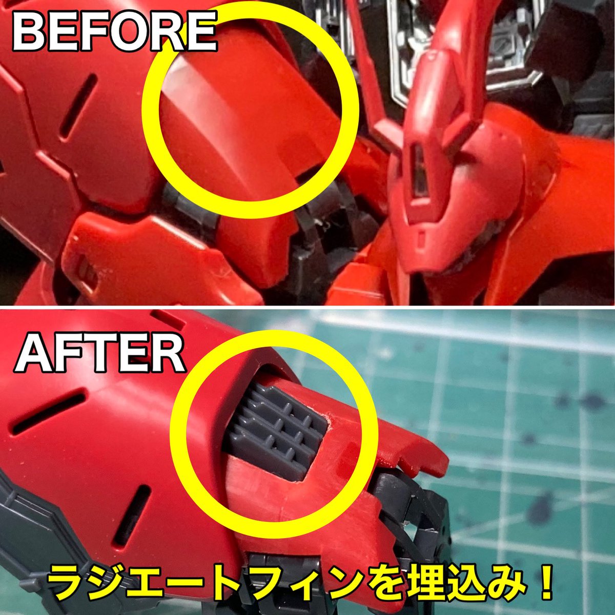 RGサザビー改修中③ 肩アーマーをぶち抜き、コトブキヤ屋さんのラジエートフィンを埋め込みました*(^o^)/* 今回の雷電はやります!!(งД)ง #逆襲のシャア #ガンプラの画像貼るとRTされると聞いて #雷電のプラモデル工房