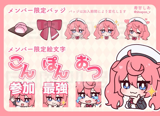 【お仕事】 寿甘しあさんのメンバーシップのバッジと絵文字のイラストを描かせていただきました! かわいくできたのでよろしくお願いします✨ twitter.com/shiapon_v/stat…