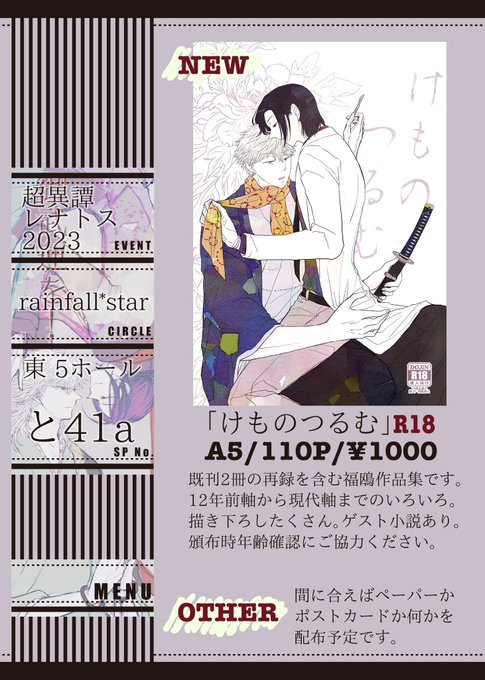 5/3スパコミ内、超レナトスお品書きです 新刊サンプルはpixivへ pixiv.net/artworks/10754… ツリーにも過去告知ツイートを提げておきます 無配はこれからがんばります どうぞよろしくおねがいいたします!
