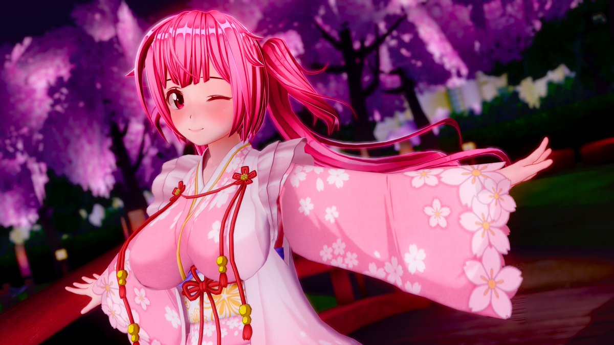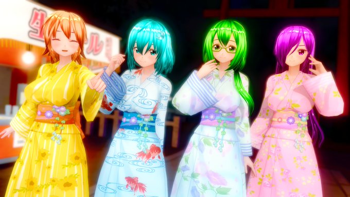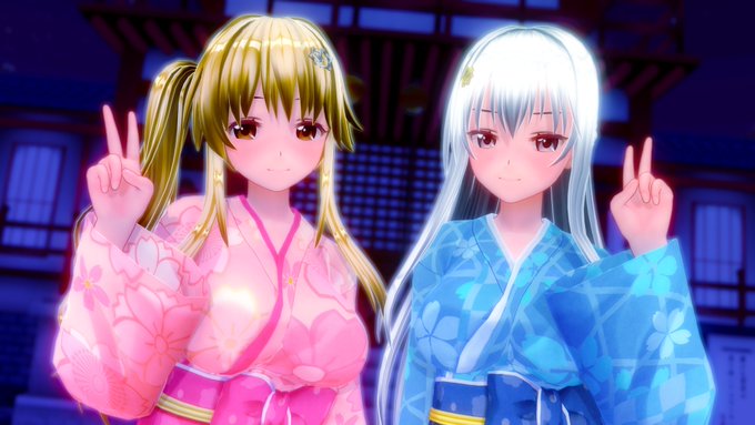 お題「着物・ご挨拶」 「デビューから約半年の私たちですが」 「どうぞ今後とも宜しくお願いします!」 「ピースサイン、だいぶ慣れてきた?」 「・・・じゃがバター、行きましょう。約束ですよね?」 (神社の初詣といったら、屋台ですよね?) #COM3D2 #cm3d版深夜の真剣エディット60分一本勝負