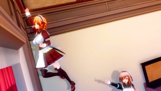 お題「壁ドン(?)」 ドン!ドン!ドン! 「・・・かったいなぁ~」 「何しているんですか!」 「天井のカドから抜ける方が早いんだって」 「だからってクラブ内の天井で練習しない!」 #COM3D2 #cm3d版深夜の真剣エディット60分一本勝負