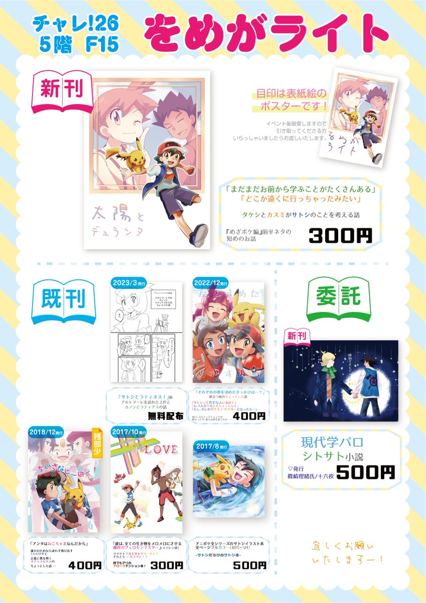ざっくりですがお品書き〜。 明日はよろしくお願いしますです〜。新しいものは新刊2冊(サトシ+ロケット団とユジキリ)とグッズと委託の素敵な小説本になりますーm(_ _)m