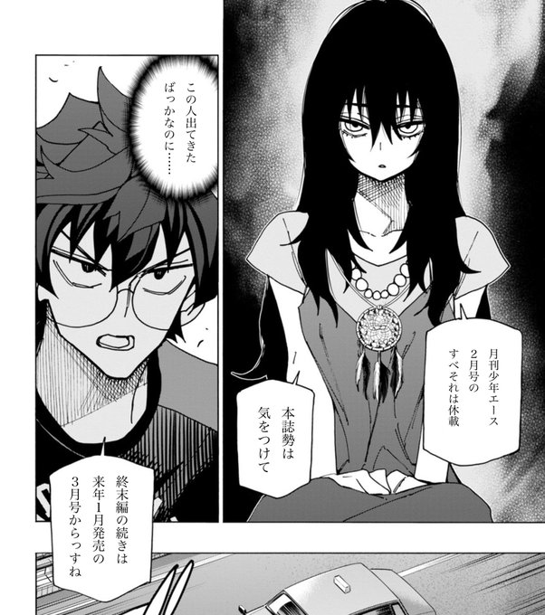 あす発売の月刊少年エース3月号に『すべての人類を破壊する。それらは再生できない。』第47話が掲載されます。目が糸みたいになってる強キャラがいいところで開眼するやつをやってます。 #すべそれ #mtgjp