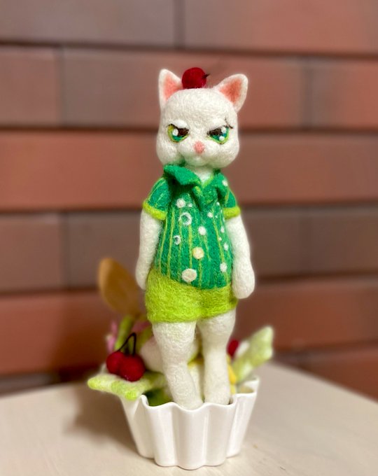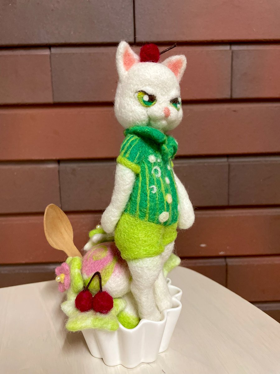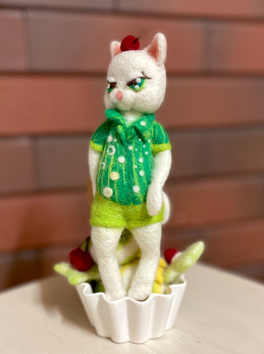 おはようございます メロンソーダニャできました💚 今日も暑くなりそうなので のどごしシュワシュワしたいですね #羊毛フェルト #ニードルフェルト #メロンソーダ
