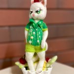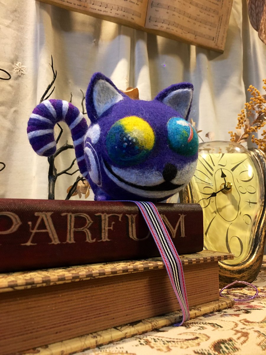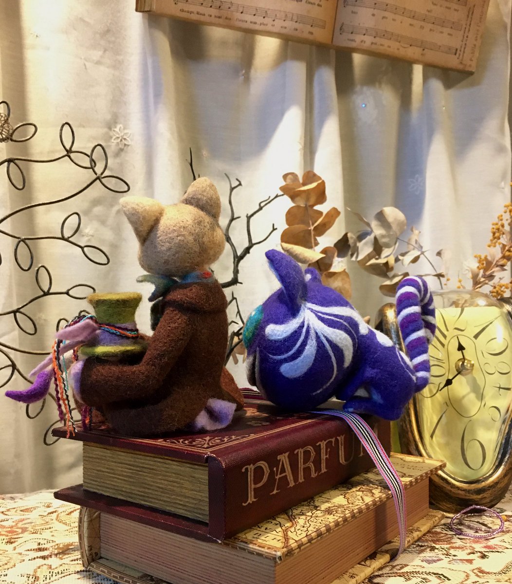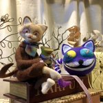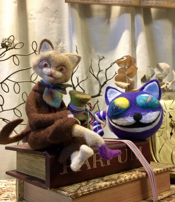 35 112 アリスの世界をイメージして 嘘っぽい猫(マッドハッター)と 顔だけ猫(チェシャ猫) できました!後でもう少し装飾します~ 顔だけ猫は目が朝と夜です💦 と言ってもインパクト足りないような…。閃きが欲しい(´ヮ`;)… #羊毛フェルト #ニードルフェルト 20/11/09 20:11