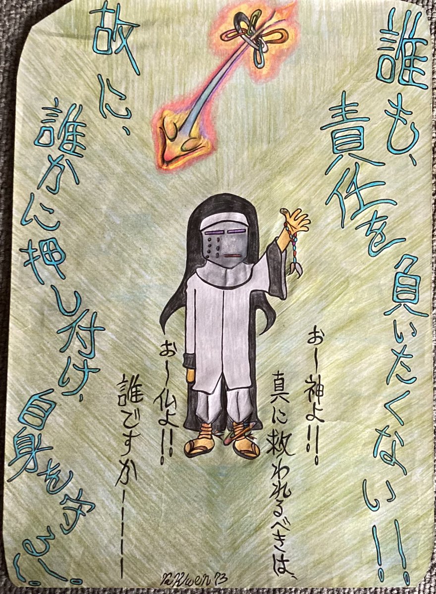 誰も、責任を負いたくない!! 故に、誰かに押し付け、 自身を守る!! お〜神よ!! 真に救われるべきは、 お〜仏よ!! 誰ですか・・・・・ by,rakuen73 #不安障害 #障害者アート #詩 #絵 #イラスト