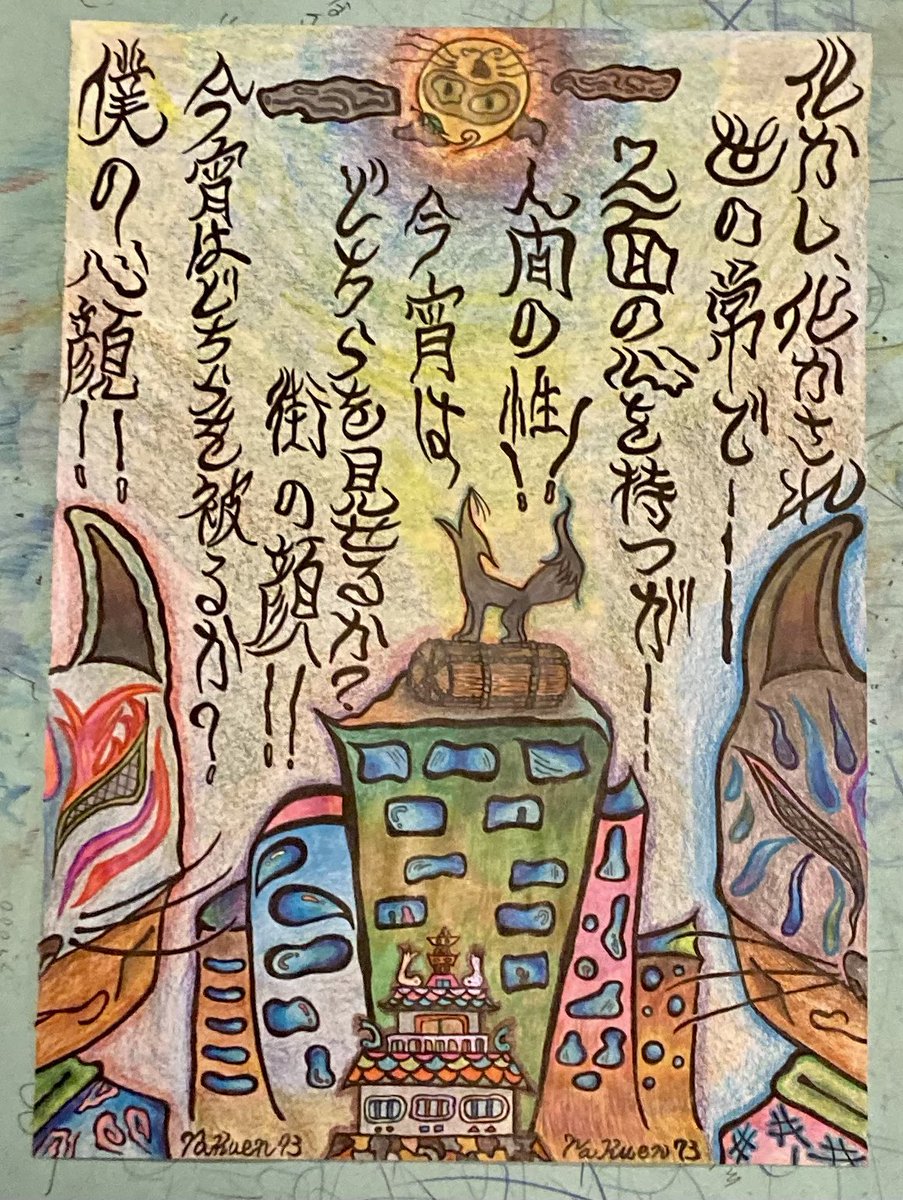 3 19 化かし、化かされ世の常で・・・・ 2面の心を持つが人間の性!! 今宵は、どちらを見せるか? 街の顔!! 今宵は、どちらを被るか? 僕の心顔!! #詩 #絵 #イラスト #障害者アート 22/10/10 22:00