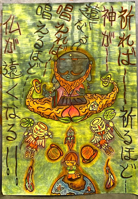 祈れば・・・・祈るほど・・・・ 神が遠くなる!! 唱えれば・・・・唱えるほど・・・・ 仏が遠くなる!! by.rakuen73 #不安障害 #障害者アート #詩 #絵 #イラスト
