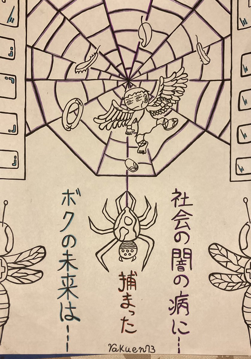 「蜘蛛の糸」 社会の闇の病に・・・ 捕まった ボクの未来は・・・ by.rakuen73 #障害者アート #確認障害 #不安障害 #発達障害 #絵 #イラスト #詩