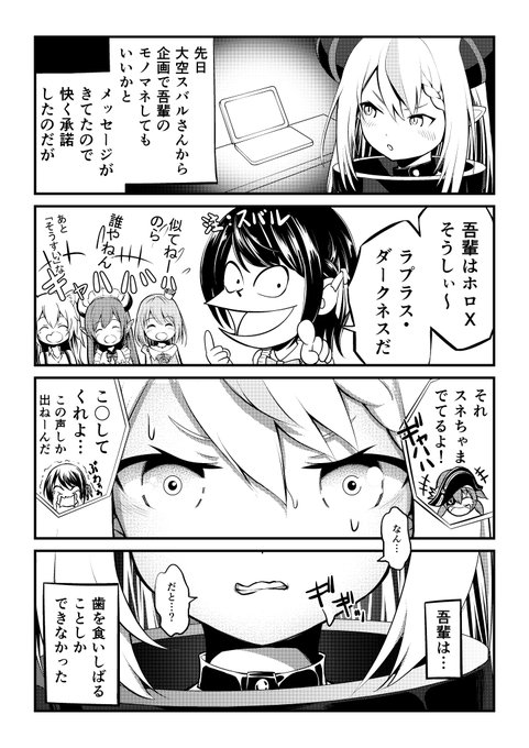 ホロ声真似へたくそ王+ラプ総帥の雑談配信をミックスした四コマ漫画描きました #Laplus_Artdesu #ホロ声真似へたくそ王