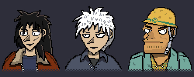 7 18 Some Fukumoto protagonists! For the few Fukumoto fans that are on this platform. (Left to right: Kaiji, Akagi, Kurosawa) #FKMT #PixelArt #ドット絵 22/10/06 11:51