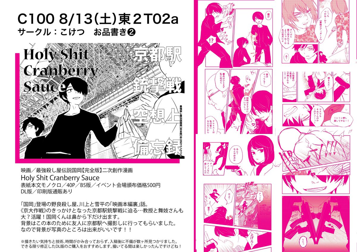 #C100 お品書き 8/13土 東2ホールT02a【こけつ】 映画「最強殺し屋伝説国岡【完全版】」の野良殺し屋、川上・雪平をメインに本編後話/本編裏話の2種頒布。 時系列的には裏話→後話です。 どちらもDL版/通販を予定しているので無理のない範囲でどうぞ。