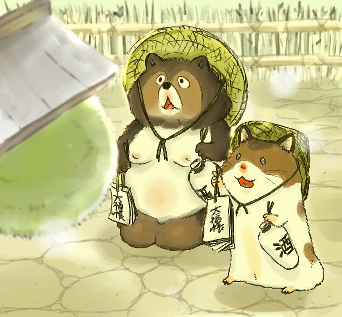 #ハムスター #イラスト 【過去絵】今日はこれっ!!タマタマ仲間のタヌキさんと酒屋の杉玉を見に行くハムちゃんです✨【再掲】