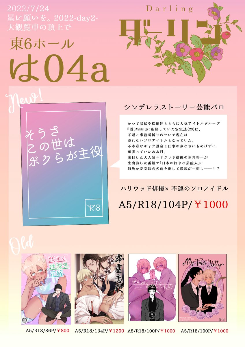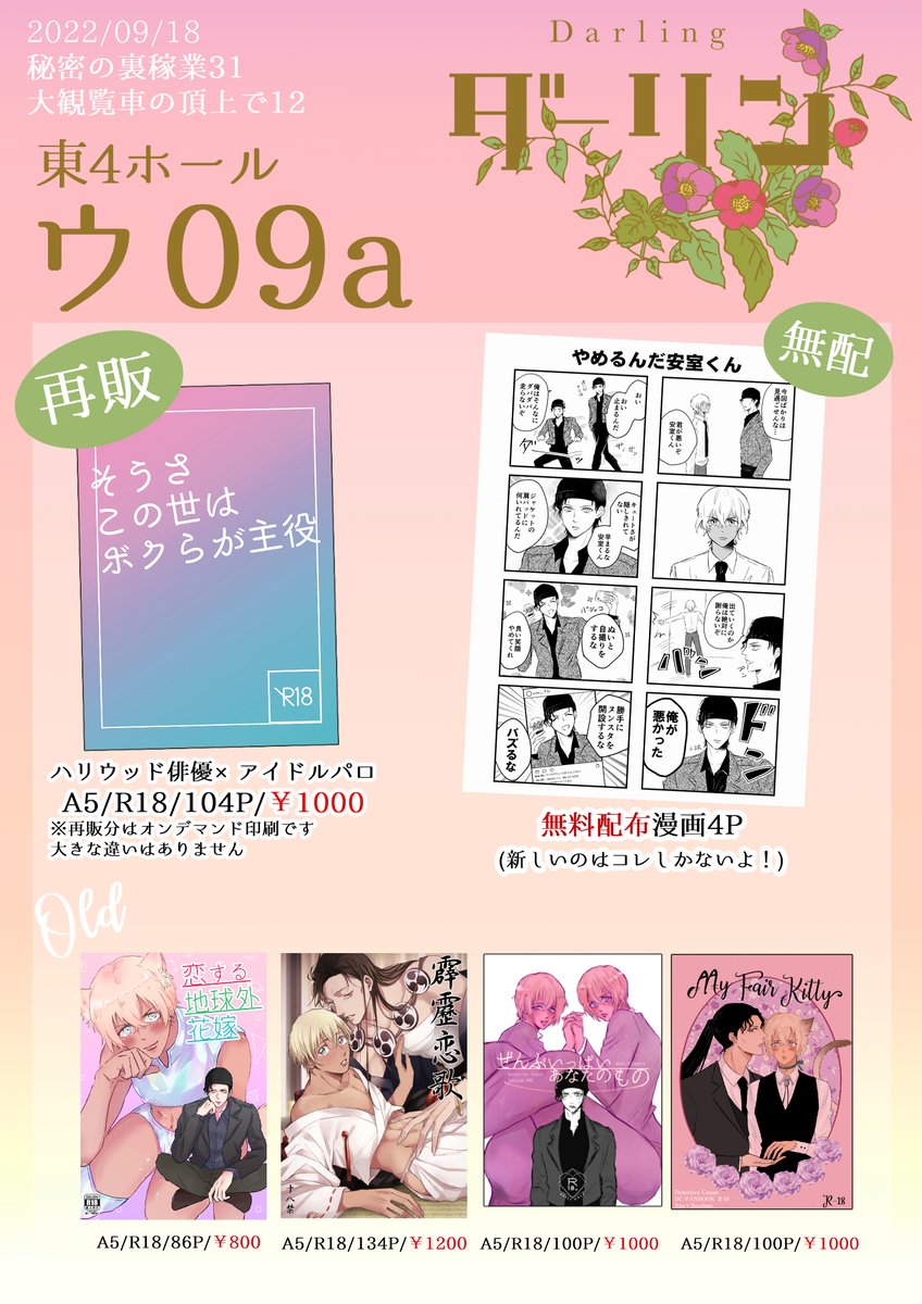 【9/18大観覧車】お品書き&無配サンプル【芸能パロ再販】 pixiv.net/artworks/10126… 前回新刊の赤安芸能パロ再販しました!通販分はイベント後にイベ残り分を追納します🐯 当日新しいものは無配ペラ漫画しかありませんが貰いついでに遊びにきてくださ~い!