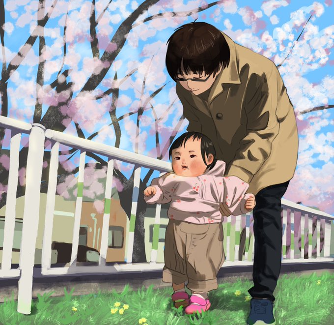 桜2枚目です🌸 最近ズンズン支え歩きで進むので、支える側の腰が爆発しそう… #育児絵日記 #育児イラスト #illustration
