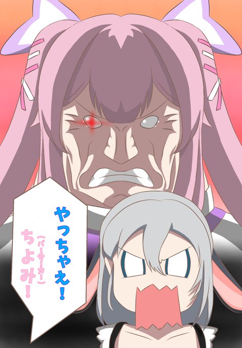 「やっちゃえ!ちよみ!」 昨日のアンコールの曲でふと思いだしたアニメ風に描きましたm(*_ _)m バーサーカー風ちよちゃんをイリヤ風ねくろさんが従え、腕相撲の勝負を仕掛けるところです。 #あおぎり高校美術部 #千代浦蝶美 #山黒音玄