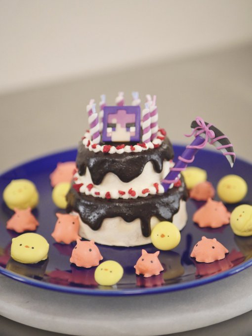 #しにちゃんはっぴよばーすでー2021 #しにがみあーと ((めちゃ遅刻すみません)) しにがみさんのマイクラ鯖に鎌主の方々が建てられたケーキを模して、ミニケーキ作らせていただきました!!🎂 ぴよとメンダコのメレンゲクッキーを添えて🐣🐙@sinigami227