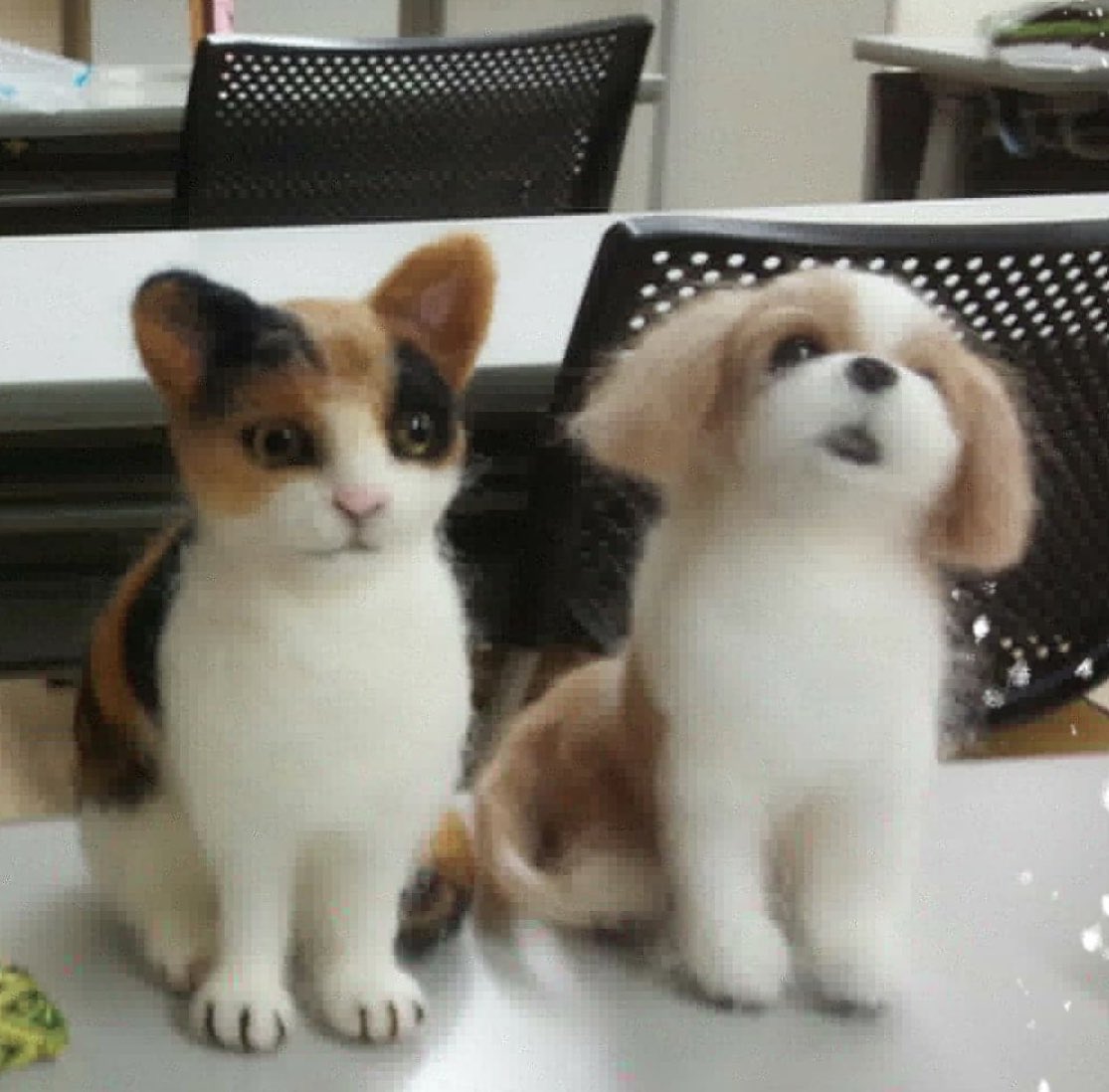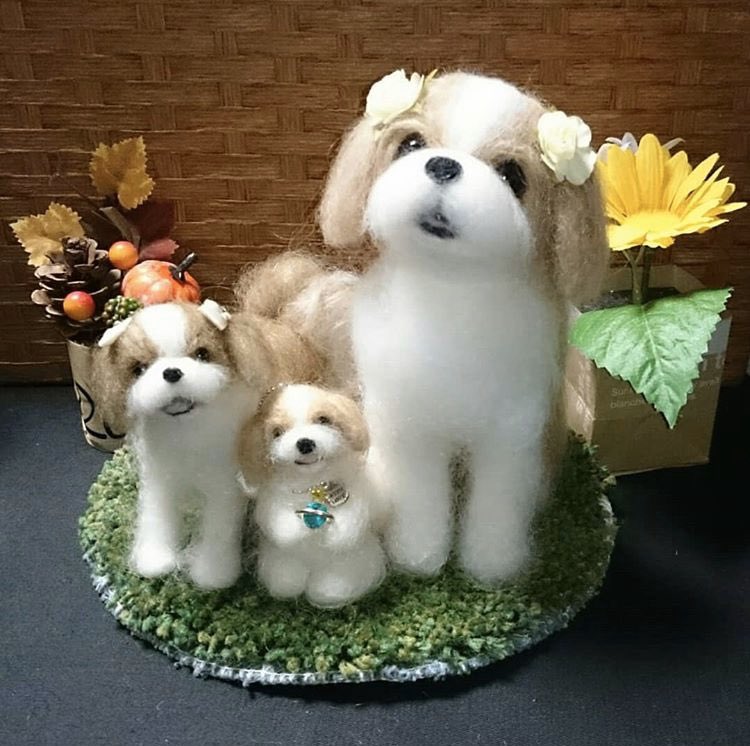 #羊毛フェルト #シーズー #三毛猫 シーズーの小さいのが手のひらサイズで、三毛猫とワンサイズ大きいシーズー。それぞれ並んでパシャリ📷✨