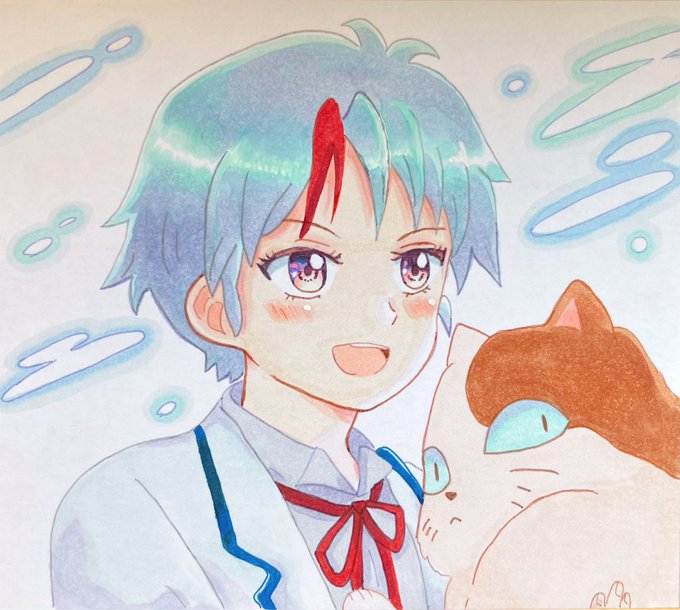 アナログでシナモンヘア理とわ💙🤍 こちらは朔らさん(@moonx1000 )が デザインしたシナモンヘア理とわを リメイクして描かせて頂きました❕ #RiTowaAnniversary2023 #理とわ記念2023 #理とわ 開催おめでとうございます〜✨