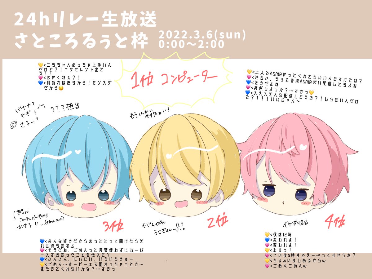 さところるぅと枠お疲れ様でした〜🙌 まさかの1位がコンピュータで笑いました!!面白かったので是非すとぷりメンバー全員でやってほしいです🍓 エペ4時までコース楽しんでください😂 #すとぷり24時間リレー生放送 #すとぷりギャラリー