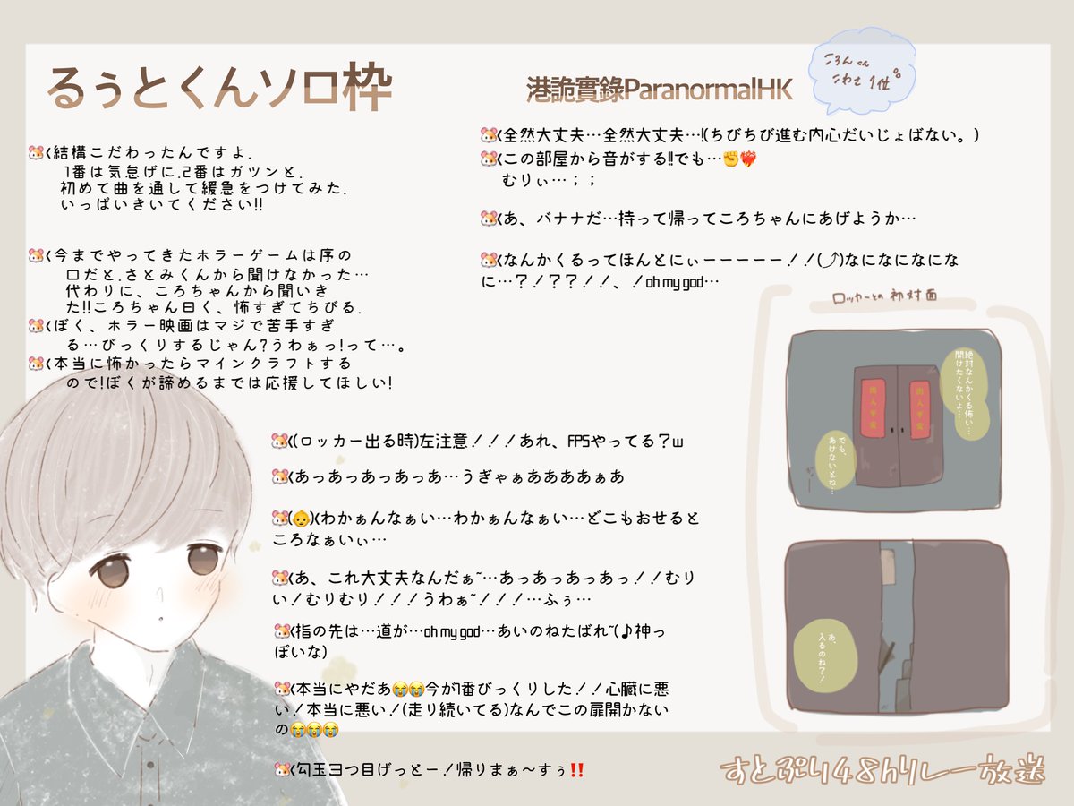 るぅとくんソロ枠ありがとうございました! ころんくんからおすすめしてもらったホラーゲーム怖かったですね…続き楽しみにしてます💀 おつるぅと!またね🐹💛 #るぅとくん #すとぷりギャラリー #すとぷり48時間リレー生放送