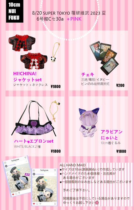 7 14 ___8/20お品書き___ SUPER COMIC CITY 関西 29 SUPER TOKYO罹破維武 2023夏 ✝6号館C セ30a✝ 10cmぬい服頒布致します👗チェキは個人チェキのみで柄選択式です🫰当日は夕女さんとイヌココでいるので遊びに来てください💝 23/08/19 07:48