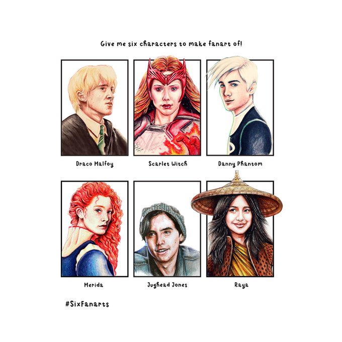 My first completed #SixFanartsChallenge entry for 2021 @t22felton as Draco Malfoy Elizabeth Olsen as Wanda Maximofr @loganlerman as Danny Phantom Saoirse Ronan as Merida @colesprouse as Jughead Jones @gabbi as Princess Raya #SixFanarts instagram.com/ray.mundo.p/