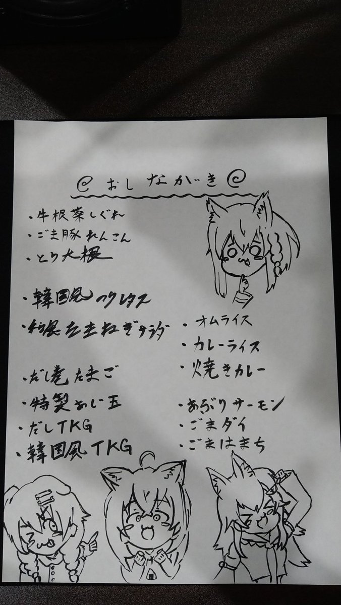 おしながきです。お決まりでしたらリプにお書きください。 #絵フブキ #できたてころね #絵かゆ #みおーん絵