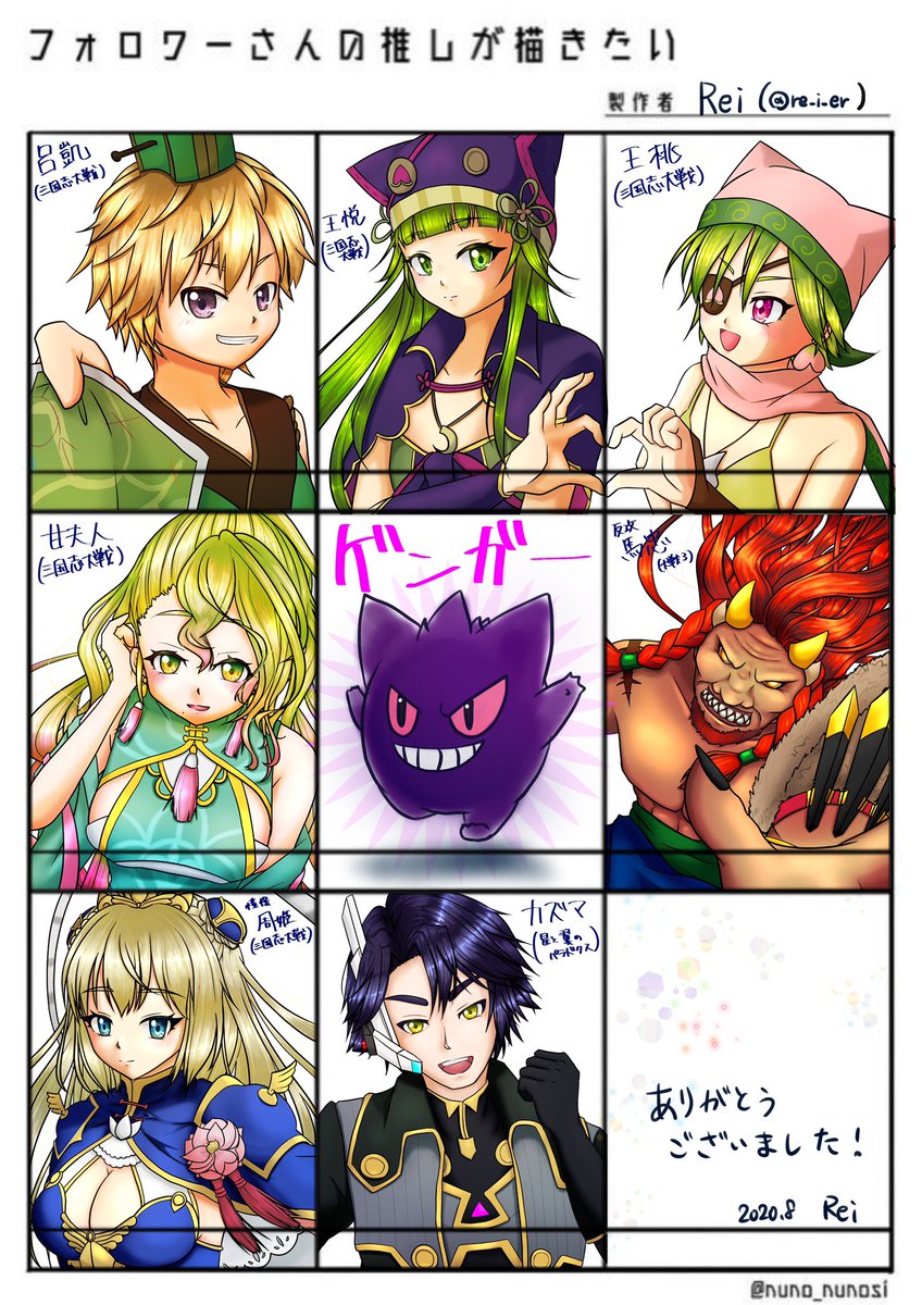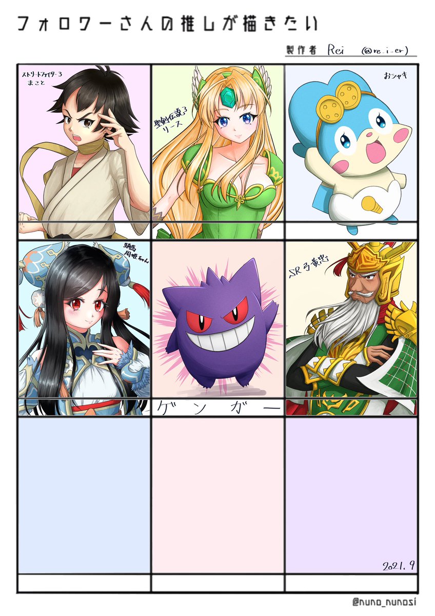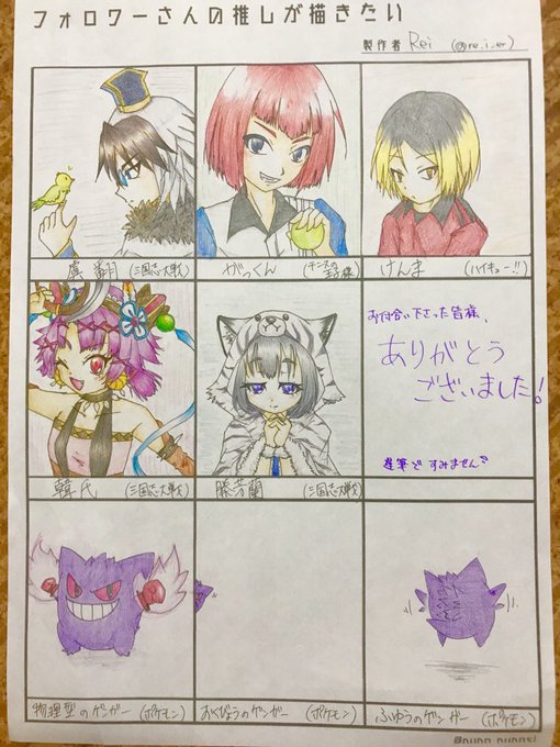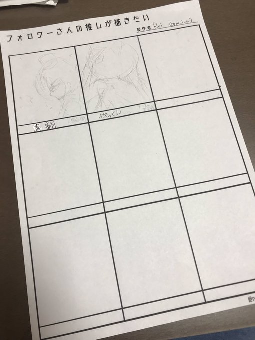 今更ながらできたー。色んな絵が描けて楽しかったです! リプありがとうございました! 宣言通り、空いた枠は自らの推しで埋めておいた(╹◡╹) #フォロワーさんの推しが描きたい
