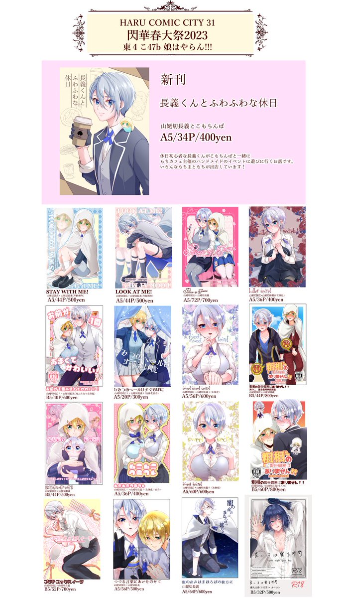 3月19日開催のHARU COMIC CITY31/閃華春大祭2023にて発行予定の新刊サンプルです!長義くんとこもちんばがもちカフェ主催のイベントに遊びに行くお話です。 長めのサンプルはpixivにて 【pixiv.net/artworks/10624…】 【通販予約】 とらのあな ecs.toranoana.jp/joshi/ec/item/… BOOTH musume-ha-yaran.booth.pm/items/4616928
