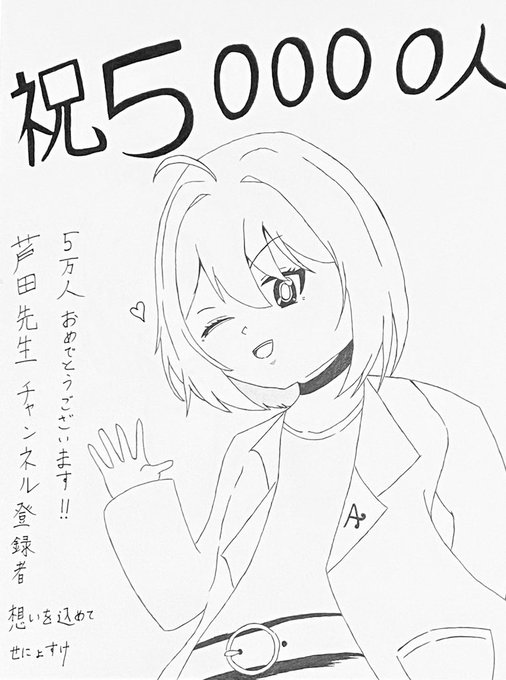 #あしだーと 芦田先生、チャンネル登録者5万人本当におめでとうございます! 記念のイラストを素人ながら描かせて頂きました。これからも体調に気をつけながら、生徒を笑顔に出来る動画を作り続けて下さい!応援しています!