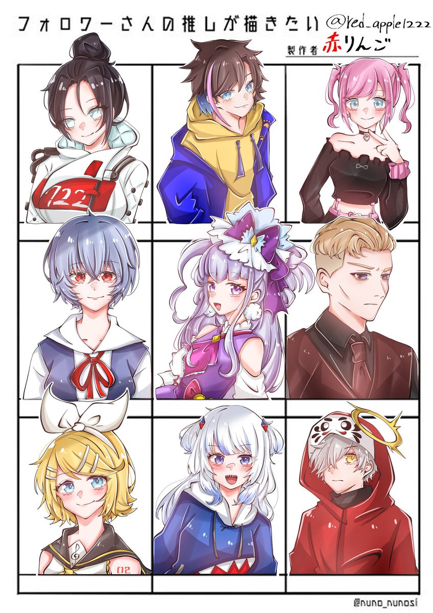 #フォロワーさんの推しが描きたい 1枚目完成しました。 リプくれた方ありがとうございます! 検疫レイス・きなこさん・ユアン・ 綾波レイ・キュアアムール・人間レヴ 鏡音リン・がうるぐら・だるまさん