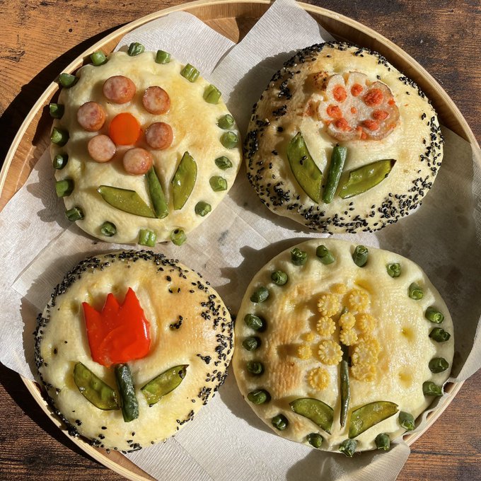 お花のブローチ風フォカッチャと、ぽってりさつまいものスープ🍠 寒かったので焼きたてのパンと温かいスープが染み渡りました🤤