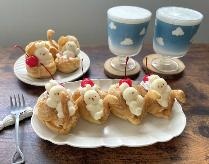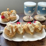 ミッフィーが乗ったスワンシューと、青空ティーでおやつ🦢☁️ シュークリームにはカスタードと生クリームがたっぷり詰まってます☺️
