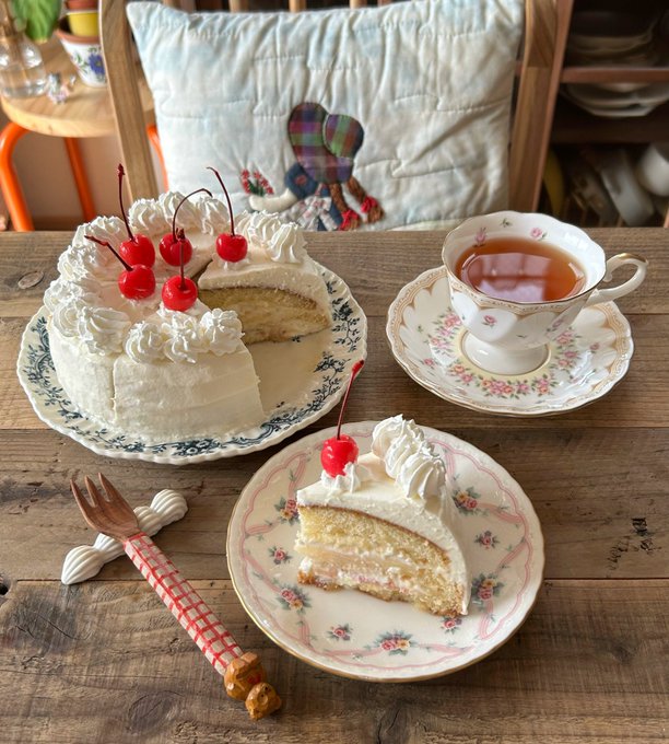 なんでもない日のケーキ🍰 桃入りのショートケーキを作りました🍑 リサイクルショップで買った食器たちも可愛い〜!