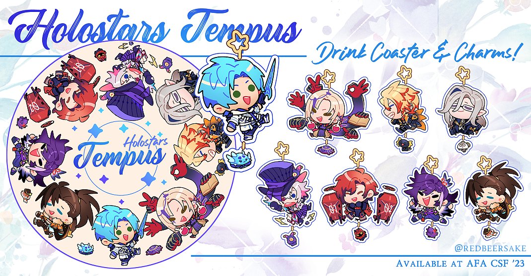 New #holoTEMPUS merch debuting at AFA CSF'23! A lovely ceramic coaster to protect your hot (and cold) drinks! Along with acrylic charms that will keep you company!