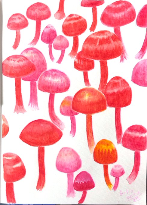今日ゎ赤いきのこをいっぱい描いてみました #きのこ #色鉛筆