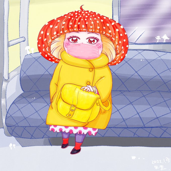 0 10 電車に乗ってたら髪が広がってきのこに見えたので描いてみました (マスク有り無しあります笑) #きのこ #きのこ頭 #自画像 #似顔絵 22/01/26 14:43