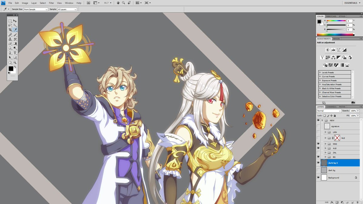 WIP: I started working on the lineart & colors for my Genshin Impact fanart & tested some effects on PS and it looks okay so far! Ningguang and Albedo are done, 3 more characters to go! #genshinimpactfanart #anime #Fanarts #WorkinProgress