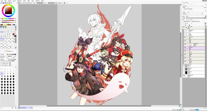 Hi guys, finally got my tablet to work again, yay! Anyway, here's a WIP screenshot of what I'm working on right now - The Geo Team from Genshin Impact! I wonder if I should put Albedo as well... 🤔 #genshinimpactfanart #fanart #WorkinProgress